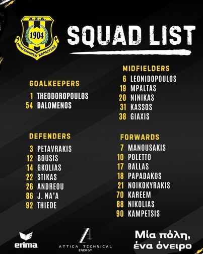 Στην αποστολή των «κιτρινόμαυρων» μετέχουν οι Θεοδωρόπουλος, Μπαλωμένος (τερματοφύλακες), Πεταυράκης, Μπούσης, Γκόλιας, Στίκας, Ανδρέου, Να’ά, Τίντε, Λεωνιδόπουλος, Μπαλτάς, Νινίκας, Κάσσος, Γιαξής, Μανουσάκης, Πολέτο, Μπαλλάς, Παπαδάκος, Μπεν Κμαγιάλ, Νοικοκυράκης, Καμπετσής, Νικολιάς.