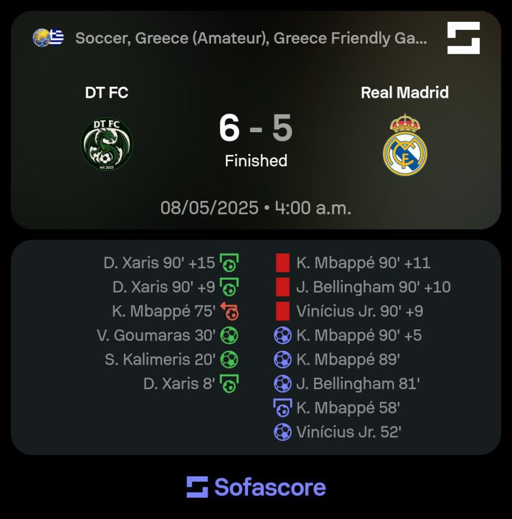 Μια απρόσμενη… ψηφιακή «χασούρα» προκάλεσε αναστάτωση στους φίλους της Ρεάλ Μαδρίτης, καθώς εμφανίστηκε στο διαδίκτυο ένα περίεργο screenshot από την εφαρμογή SofaScore που υποτίθεται πως δείχνει νίκη με 6-5 της ερασιτεχνικής ελληνικής ομάδας DT FC επί της «βασίλισσας».