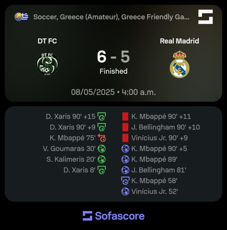 Μια απρόσμενη… ψηφιακή «χασούρα» προκάλεσε αναστάτωση στους φίλους της Ρεάλ Μαδρίτης, καθώς εμφανίστηκε στο διαδίκτυο ένα περίεργο screenshot από την εφαρμογή SofaScore που υποτίθεται πως δείχνει νίκη με 6-5 της ερασιτεχνικής ελληνικής ομάδας DT FC επί της «βασίλισσας». Παρά τις έντονες προσπάθειες των Μαδριλένων για αναβολή της πρεμιέρας στη La Liga, η πορεία της ομάδας […]